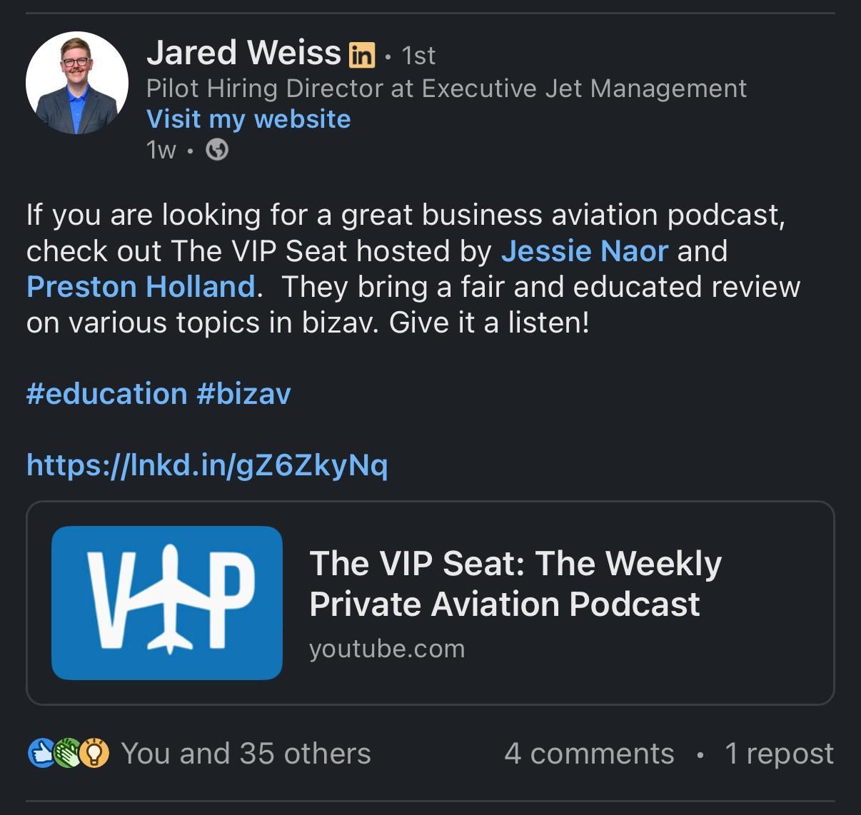 Subscriber Shoutout: Big thank you to Jared Weiss for the kind words on LinkedIn this week! Jared is the Pilot Hiring Director at Executive Jet Management and gave us a shoutout to his network. We appreciate you, Jared.