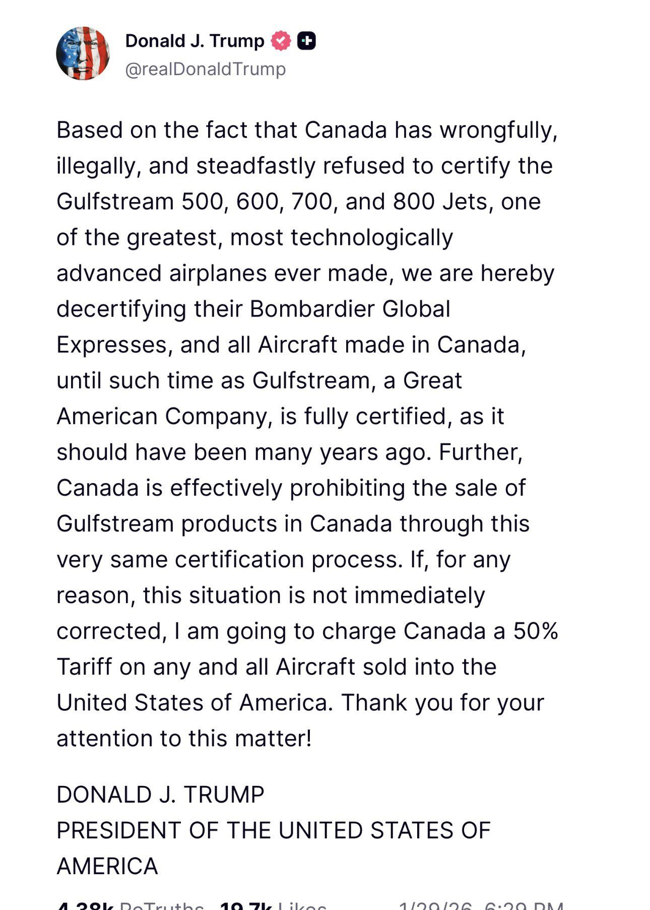 The President's statement addressed Canada's failure to certify Gulfstream's G500, G600, G700, and G800 aircraft, calling them "one of the greatest, most technologically advanced airplanes ever made." In response, Trump announced he is "decertifying" Bombardier Global Express aircraft and all Canadian-made aircraft. He further threatened a 50% tariff on any Canadian aircraft sold into the United States if the situation is not "immediately corrected."